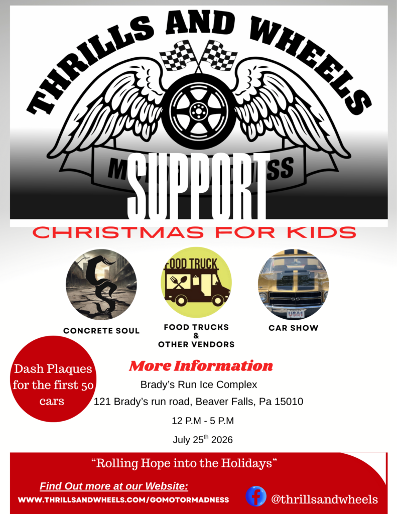 Get ready to rev up your engines and join us for an unforgettable day of horsepower, family fun, and holiday spirit at the Thrills and Wheels Motor Madness Car Cruise, benefiting Christmas for Kids! Mark your calendars for July 25th, 2026, from 12 PM to 5 PM, at the Beaver County Ice Arena (121 Brady’s Run Rd, Beaver Falls, PA). Whether you’re a car enthusiast, a music lover, or just looking for a fantastic day out with the family, this event has something for everyone!